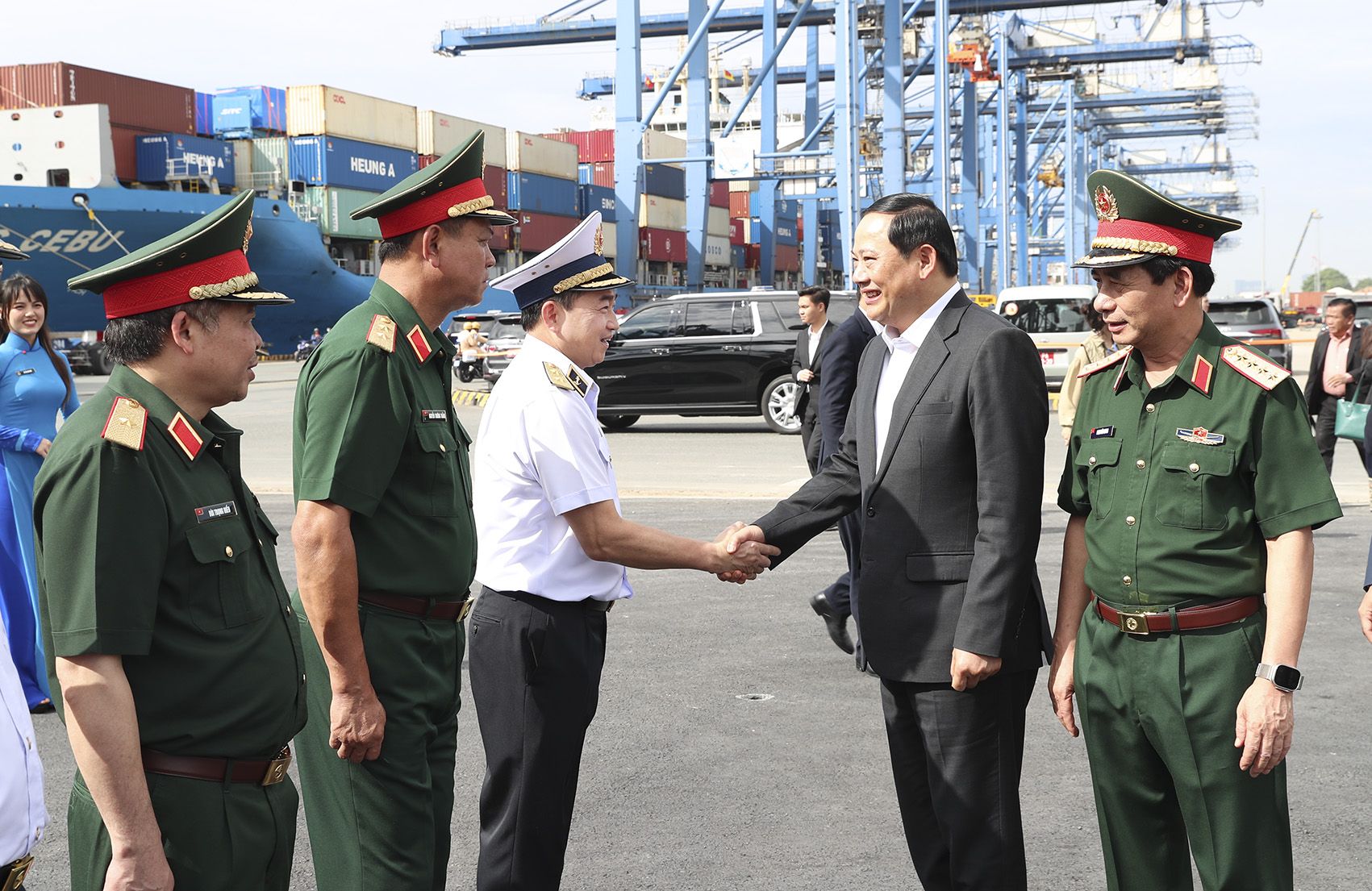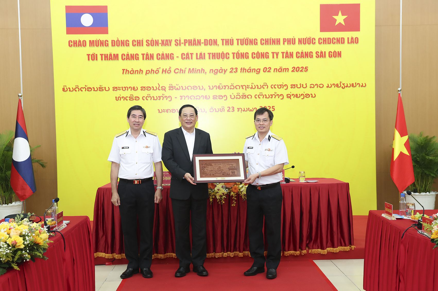 On the morning of February 23, the Prime Minister of the Lao People’s Democratic Republic, Mr. Sonexay Siphandone, and his delegation visited and worked at Tan Cang - Cat Lai Terminal (TCCL), part of the Saigon Newport Corporation (SNP) under the Vietnam People's Navy. General Phan Van Giang, Politburo Member, Deputy Secretary of the Central Military Commission, and Minister of National Defense of Vietnam, presided over the welcoming ceremony.