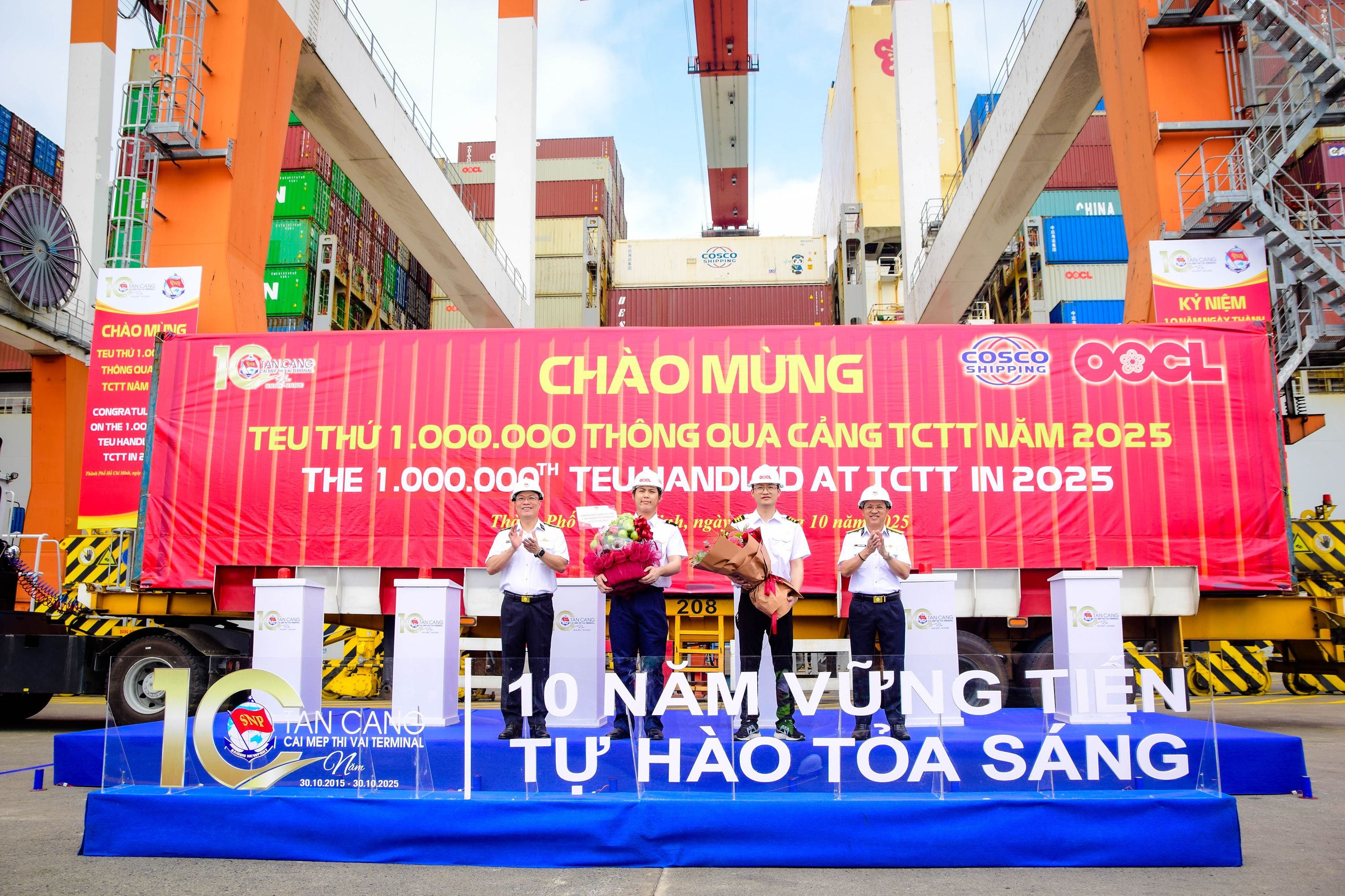 On October 27, 2025, at Tan Phuoc Ward, Ho Chi Minh City, Tan Cang – Cai Mep Thi Vai Terminal (TCTT) – a member of Saigon Newport Corporation (SNP) – proudly welcomed its 1,000,000th TEU, 45 days earlier than in 2024. This remarkable achievement marks a significant milestone in celebration of the terminal’s 10th anniversary (October 30, 2015 – October 30, 2025).