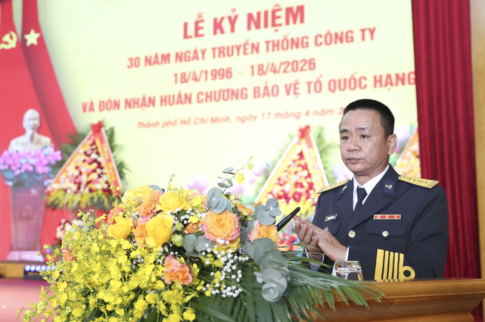 Đại tá Nguyễn Chí Dũng, Giám đốc Công ty Xây dựng Công trình Tân Cảng trình bày diễn văn