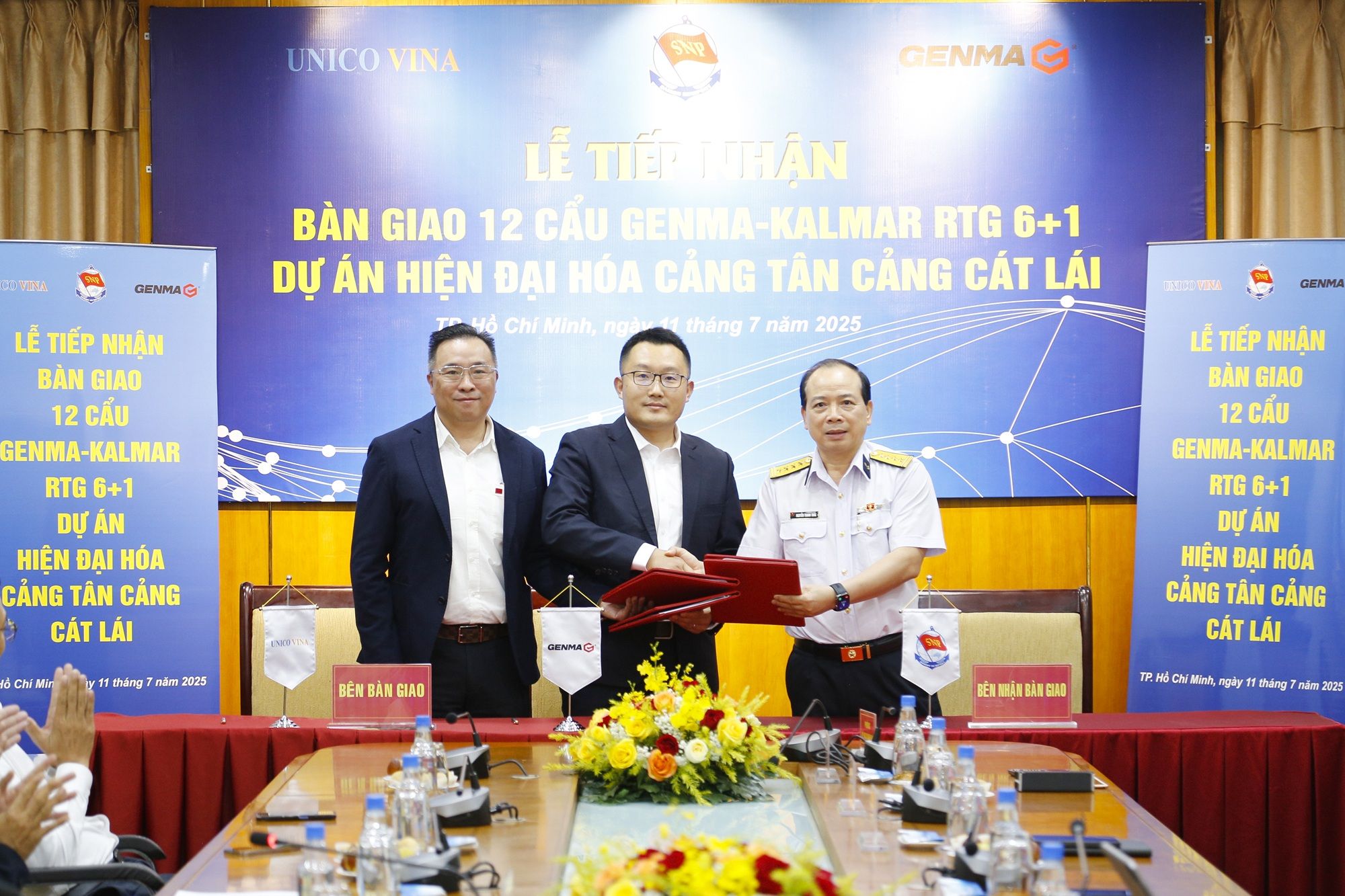 Đại diện đối tác trao biên bản bàn giao 12 cẩu khung Genma - Kalmar RTG6+1 cho Tân Cảng Sài Gòn