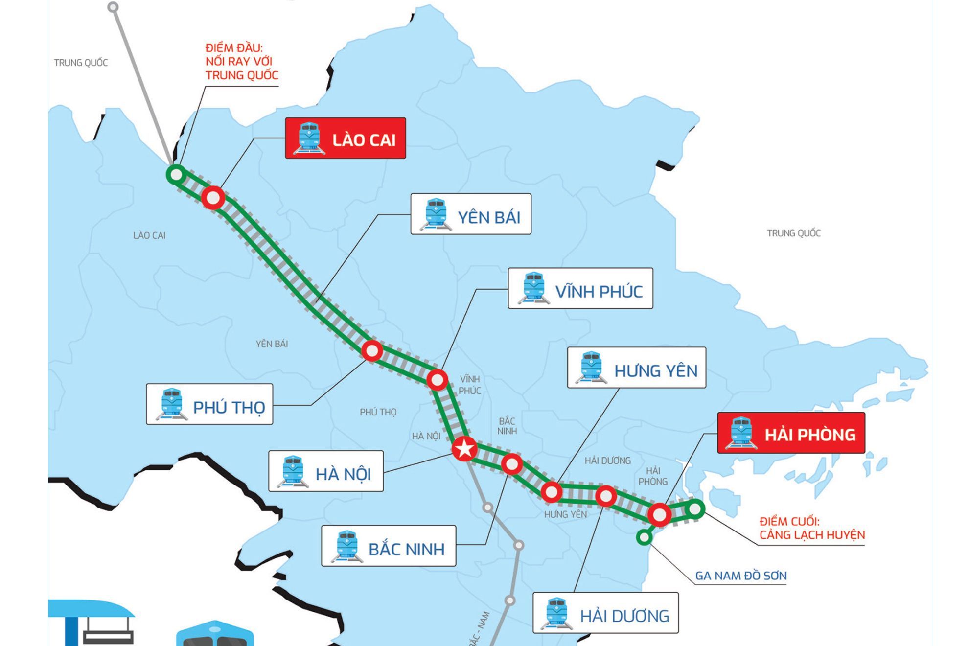 Tuyến đường sắt Lào Cai – Hà Nội – Hải Phòng được khởi công trong năm 2025, với chiều dài tuyến chính khoảng 390,9 km, tuyến nhánh 27,9 km, khổ đường 1.435 mm, tốc độ thiết kế 160 km/h, vận chuyển cả hành khách và hàng hóa.