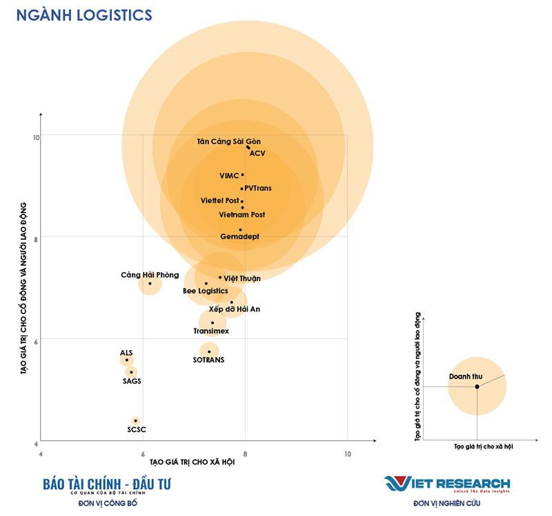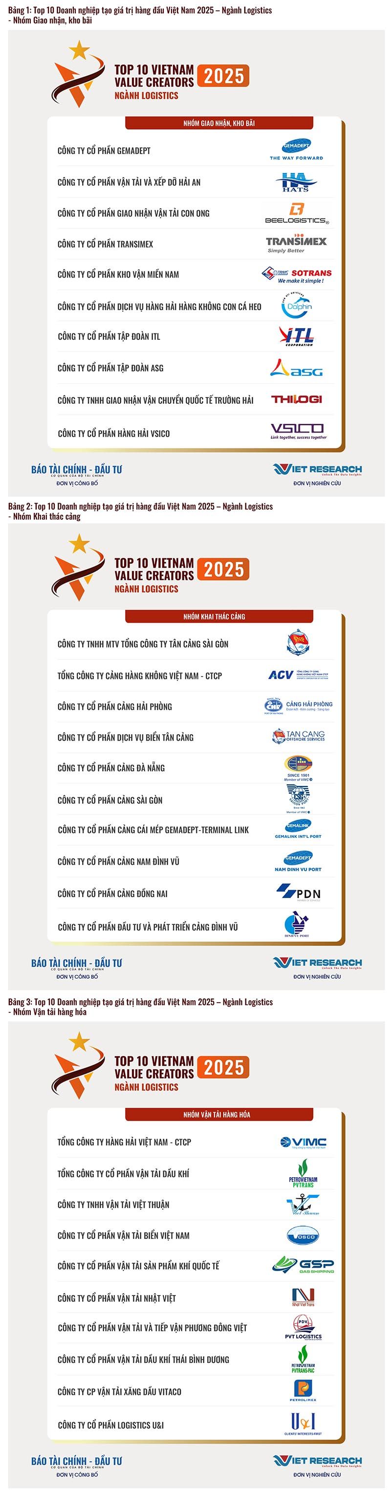 Trong khuôn khổ Chương trình Nghiên cứu toàn quốc về các Doanh nghiệp tạo giá trị hàng đầu Việt Nam, Viet Research phối hợp với Báo Tài chính - Đầu tư (Bộ Tài chính) công bố Top 10 Doanh nghiệp tạo giá trị hàng đầu Việt Nam 2025 - Ngành Logistics. Đây là những doanh nghiệp tiên phong trong việc tạo dựng giá trị cho nền kinh tế và xã hội, thể hiện qua: quy mô và tốc độ tăng trưởng; lợi nhuận và đóng góp cho ngân sách; môi trường, chính sách và phúc lợi lao động; cam kết về ESG và đổi mới sáng tạo.
