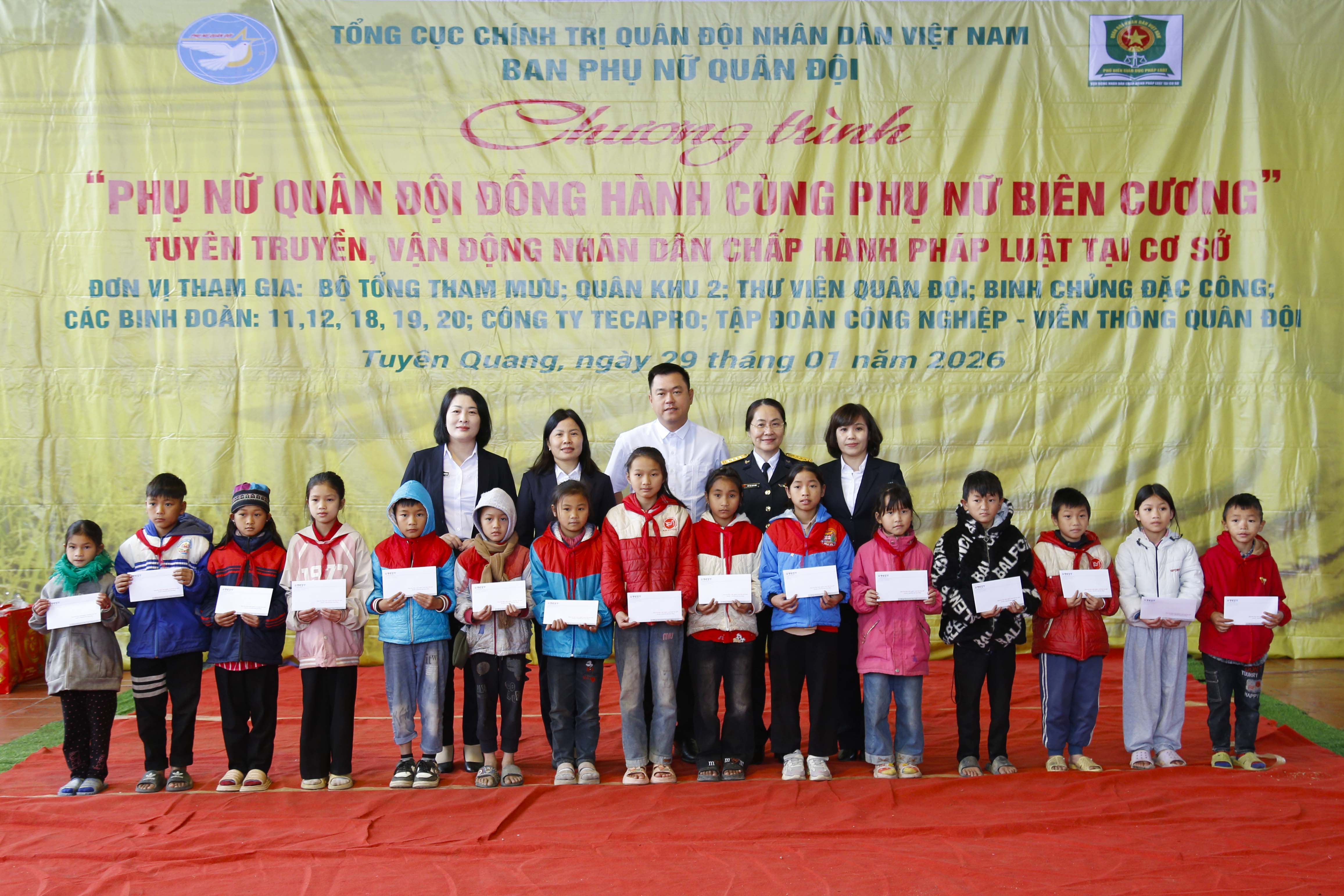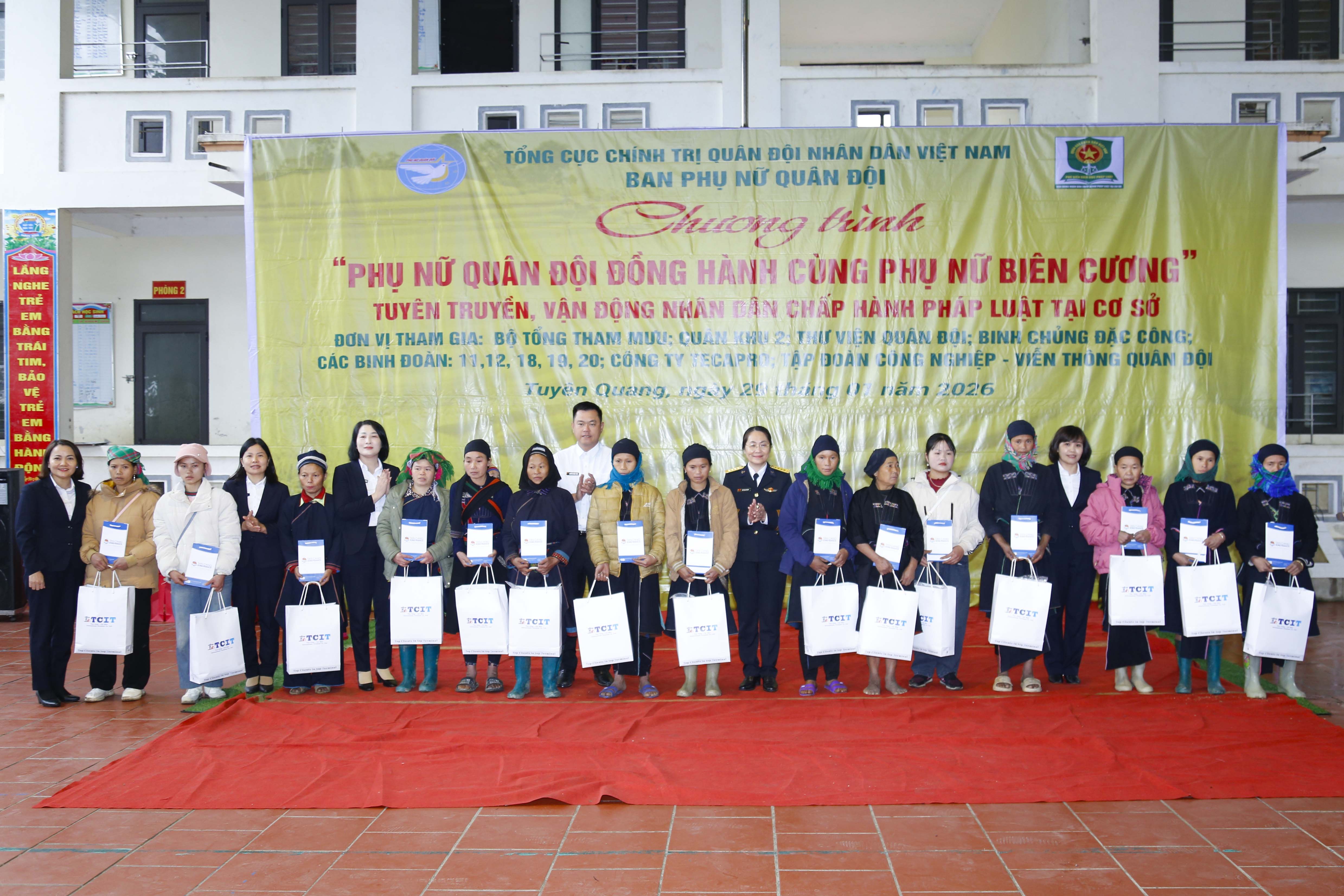 Cũng trong dịp này, Ban Phụ nữ Quân đội phối hợp với các đơn vị trong toàn quân tổ chức trao tặng 10 ngôi nhà Mái ấm tình thương và hàng trăm phần quà ý nghĩa cho bà con và học sinh vùng biên giới tỉnh Tuyên Quang.