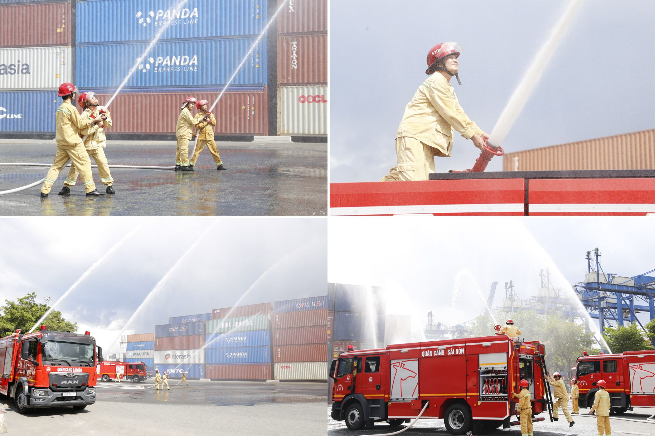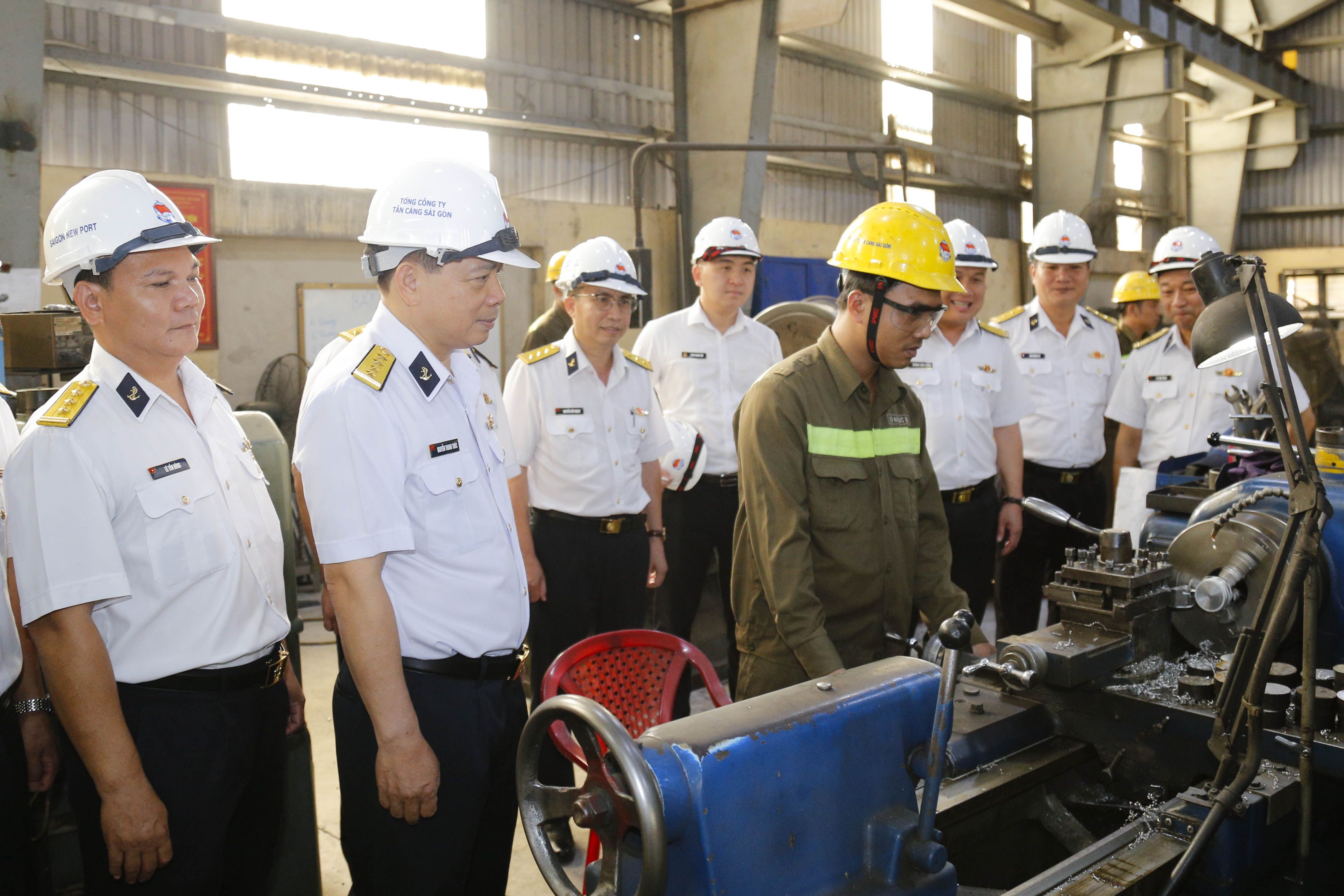 Sau buổi lễ, lãnh đạo Tổng Công ty cùng các lực lượng kiểm tra hiện trường sản xuất tại Trạm sửa chữa Cát Lái thuộc Công ty cổ phần Dịch vụ Kỹ thuật Tân cảng, tổ chức thao diễn phương án chữa cháy container tại bãi hàng Terminal Cát Lái A.