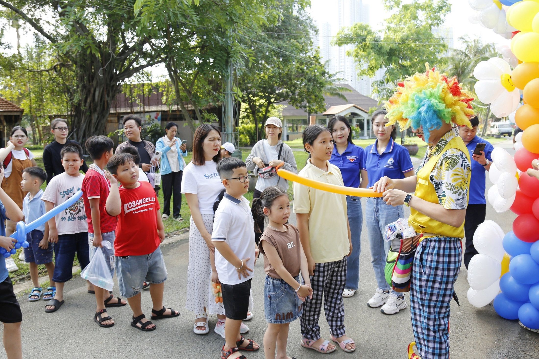 Các em thiếu nhi xếp hàng nhận những đồ chơi bóng bay